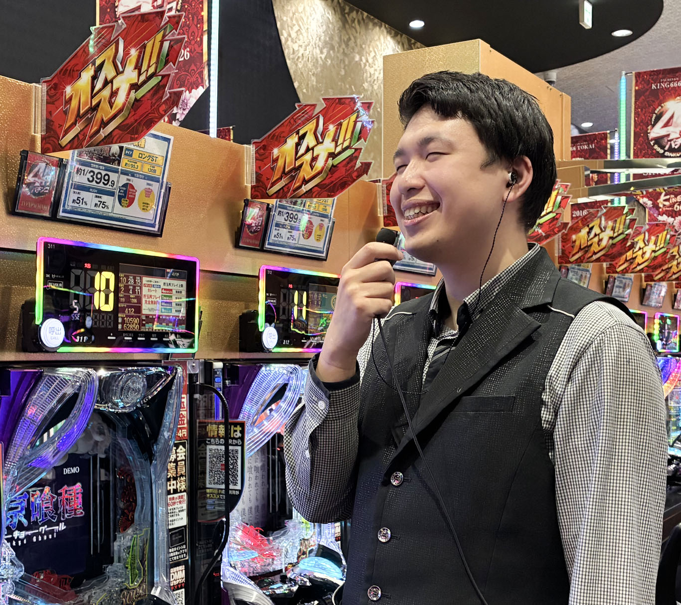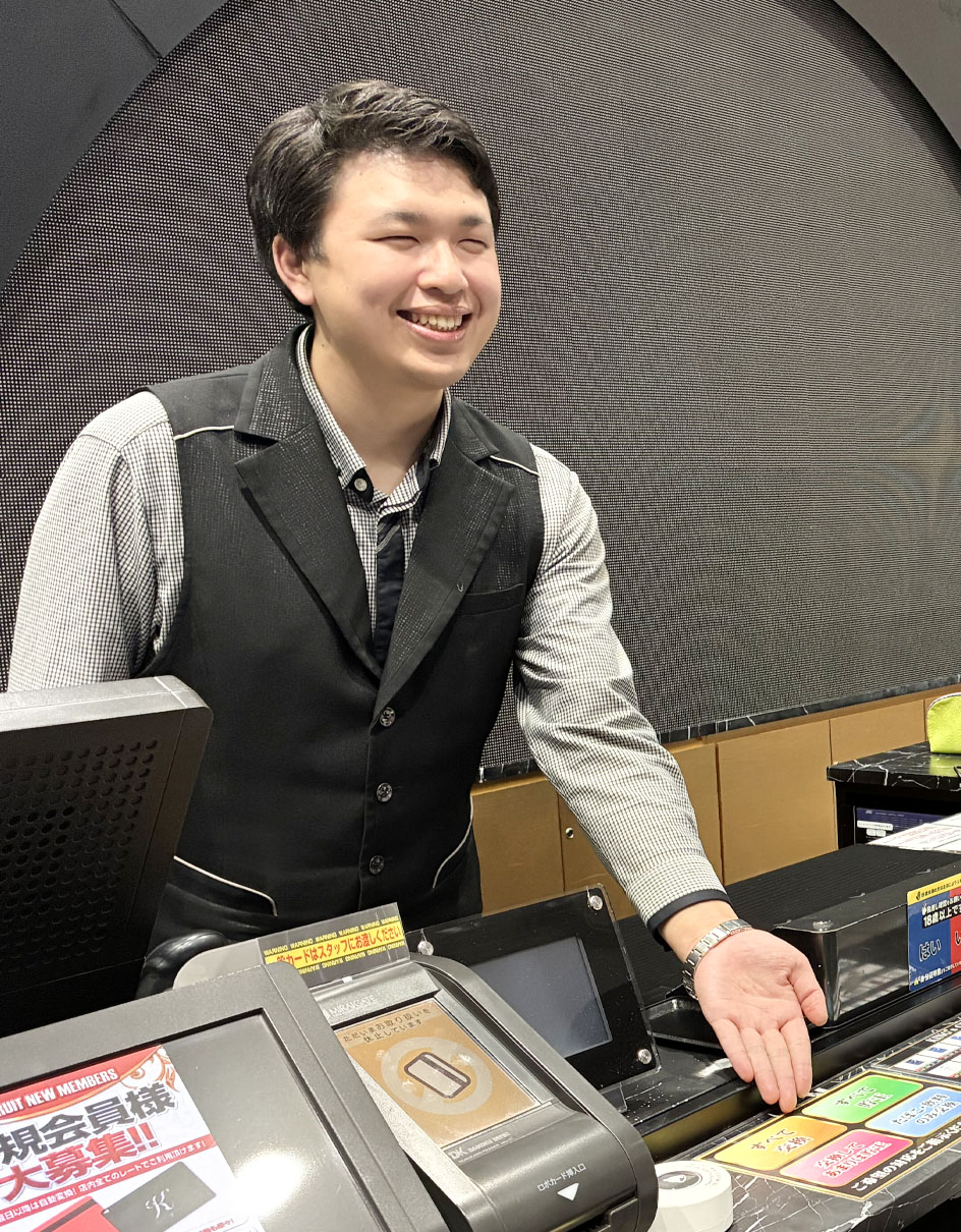 開店。お客様をお出迎えし、ホールの運営・接客を行う。遊技台に故障や異常がないか、リアルタイムでチェック。