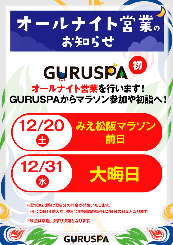 【松阪温泉GURUSPA】12/20、12/31オールナイト営業のお知らせ