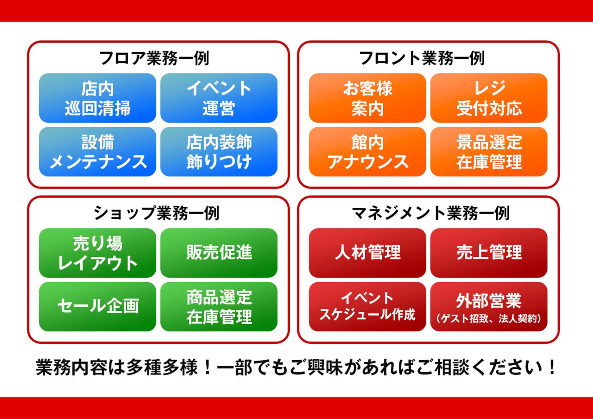 ご経験者や、経験を積まれた方には店舗運営・イベント企画・マネジメント業務もお任せしていきます